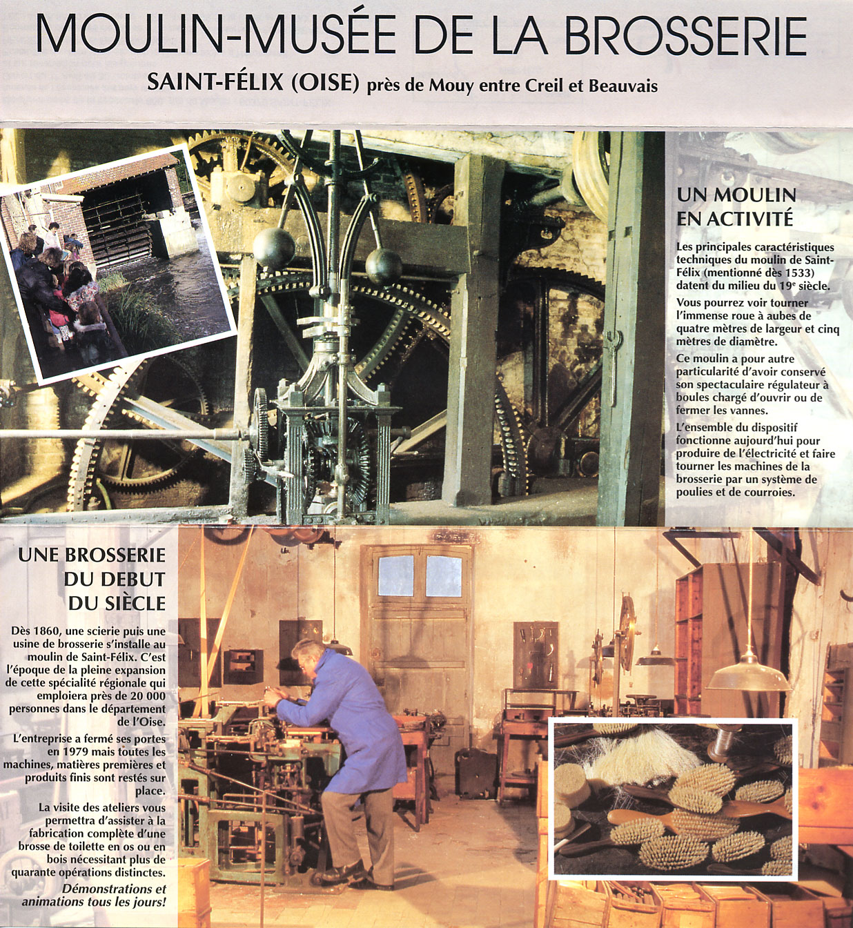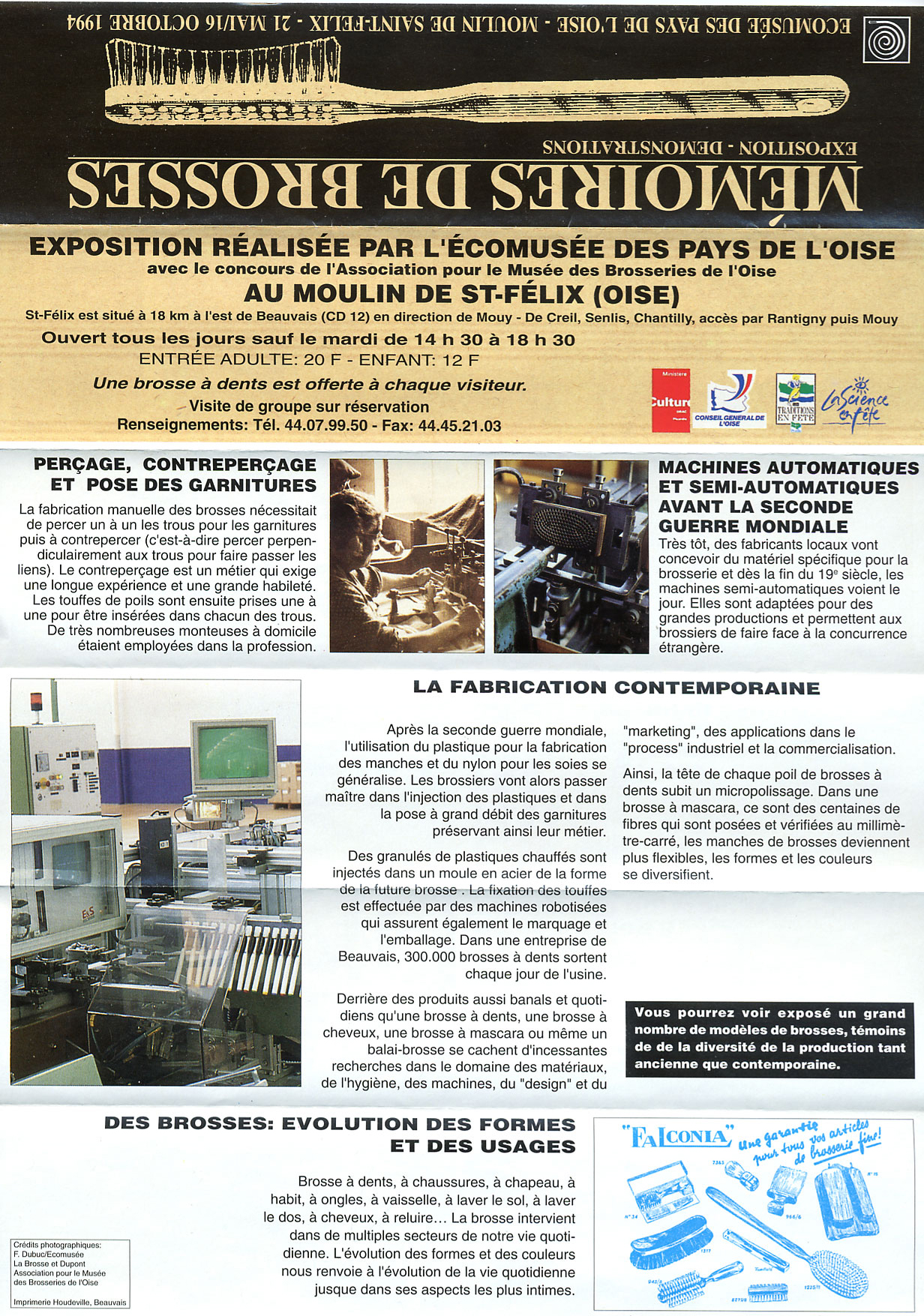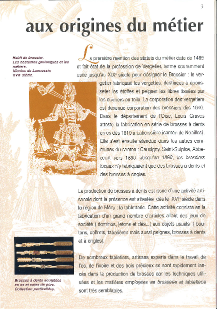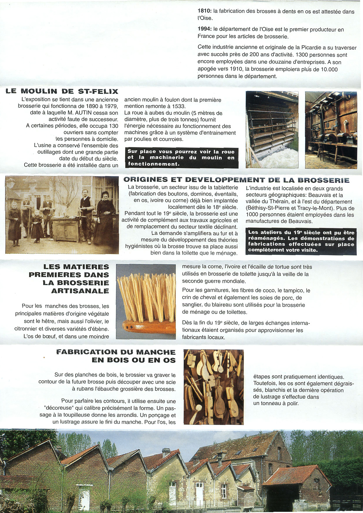 Le métier de brossier est très ancien mais c'est à partir du XIX. siècle secteurs techniques: la brosse de ménage pour l'entretien de la maison, le pinceau pour la peinture en bâtiment, le pinceau fin pour l'artiste et le maquillage, la brosse industrielle constituant des éléments de machines et enfin la brosse de toilette pour soins corporels, spécialité de notre département de l'Oise.