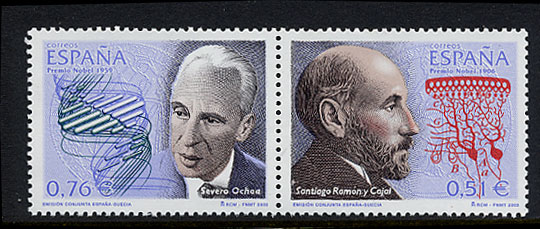 2003 n° 3534 - 3535 3534 : Santiago Ramon y Cajal (histologiste) Prix Nobel en 1906 avec Camillo Golgi (structure du système nerveux) 3535 : Severo Ochoa (biochimiste) Prix Nobel en 1906 avec Arthur Kornberg (mécanisme de la synthèse biologique de l'ADN) |