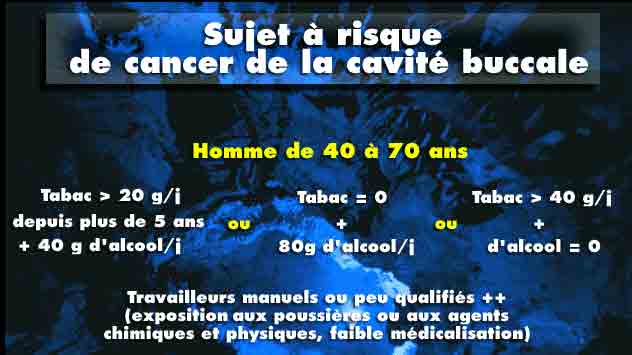 Maladies buccalesDes effets locaux se produisent à l'endroit où le tabac est en contact direct avec la muqueuse de la bouche. Les dents sont tachées de façon permanente, le sucre favorise la carie dentaire, la gencive enfle, saigne et se rétracte causant une récession des gencives. L'inflammation de la gencive (la gingivite) ou l'érosion des tissus de support et de l'os qui soutiennent la dent (la périodontite) peuvent ou non s'ensuivre. Le rôle du tabac sans fumée dans le développement et la progression de la gingivite et de la périodontite demeure imprécis. Une diminution du goût, de l'odorat et la mauvaise haleine sont fréquentes et l'utilisateur doit cracher de façon continue. Le lien entre l'utilisation du tabac sans fumée et les cancers de la bouche ne sont plus à démontrer. Les leucoplasies, qui peuvent apparaître sur la joue, la gencive ou la langue, surviennent chez plus de 50 % des utilisateurs après à peine trois ans de consommation de tabac sans fumée. De 3 à 5 % de ces plaques deviendront cancéreuses. Le risque de développer un cancer de la bouche est d'environ quatre fois plus élevé chez les utilisateurs de tabac sans fumée que chez les non-utilisateurs ; il commence à se manifester en général après environ une vingtaine d'années d'utilisation. L'alcool accélère ce processus. Après 50 ans d'utilisation chez les femmes, le risque de cancer de la gencive et de la muqueuse buccale serait jusqu'à 50 fois plus élevé que chez les non-utilisatrices. L'alcool accélère ce processus. Les effets systémiques du tabac sans fumée sont le résultat de l'absorption dans le sang de la nicotine et des autres produits chimiques. Le coeur bat plus vite et parfois irrégulièrement, la pression monte, les vaisseaux se contractent. La prévalence de crises cardiaques et d'autres formes de cancers est peut-être également augmentée, mais les données actuelles sont insuffisantes pour permettre de statuer à ce sujet. Le tabac sans fumée ne représente donc pas une solution de rechange sécuritaire à l'usage de la cigarette. Que le tabac soit placé dans la bouche ou fumé, il n'en demeure pas moins un danger pour la santé. Les adeptes du tabac sans fumée doivent, comme les fumeurs, en abandonner l'usage aussitôt que possible. La thérapie de remplacement de nicotine sous forme de gomme de nicotine ou de timbre transdermique peut aider les personnes motivées à abandonner ces produits. Le support d'un professionnel de la santé ou d'un groupe d'abandon s'avérera également utile. Hygiène dentaire et effets du tabac Nous