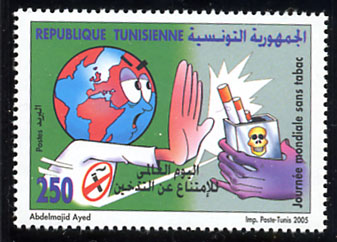 récidivantes de 48 pc quand les deux parents sont fumeurs. La Poste Tunisienne a émis un timbre-poste en 2005 à l'occasion de la célébration par la Tunisie, le 31 mai de chaque année, de la journée mondiale sans tabac, instituée par l'Organisation Mondiale de la Santé (OMS), en vue de sensibiliser davantage quant aux dangers sanitaires qui menacent les personnes et de mettre en relief les répercussions négatives du tabagisme sur tous les domaines économique, social et éducatif, dans les différents pays du monde et en particulier les pays émergents. Le tabagisme est considéré comme étant un fléau des plus menaçants surtout pour les fumeurs, puisqu'il est à l'origine de près de 25 maladies, dont notamment les maladies cardio-vasculaires, le cancer du poumon, les maladies respiratoires, les otites et autres...