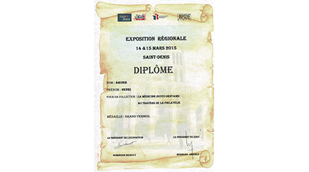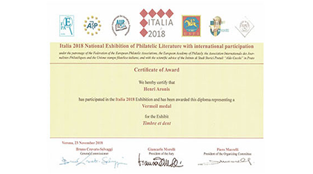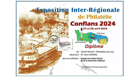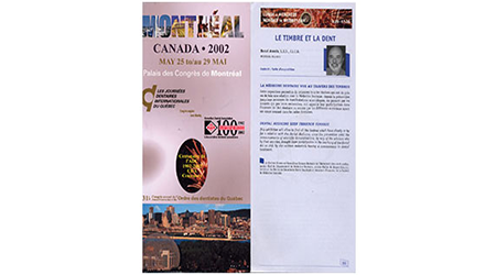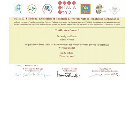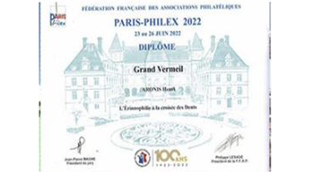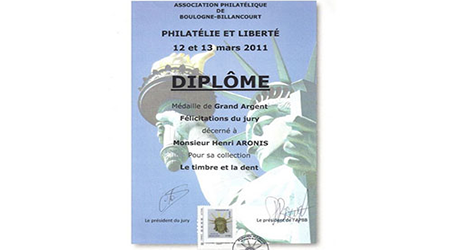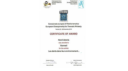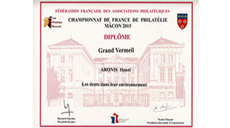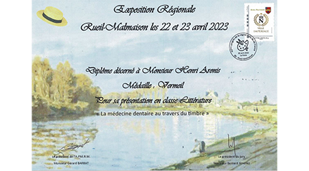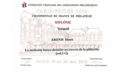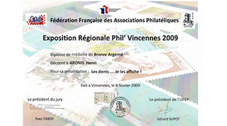Expositions dentaires & autres. De la plus récente à celle du début en 2002. Uruguay (février 2025)Médaille VERMEIL Médaille de VERMEIL pour le site web"La Médecine dentaire au travers des timbres. Rueil-Malmaison (mars 2025)Médaille VERMEIL Médaille de VERMEIL pour la collection"La diversité des timbres. La forme et la composition des timbres." Conflans Ste Honorine (avril 2024)Médaille G. Vermeil Médaille de Grand Vermeil pour la collection"Usage du timbre fiscal dans le domaine médical." Phila-France (mai 2023)Médaille OR x Médaille d'OR pour la collection"L'Erinnophilie à la croisée des dents" Rueil-Malmaison (2023) Site web (Vermeil) Exposition de mon site 'timbreetdent.eu' Dunkerque 2022 L'Apothicairerie (G. Vermeil) Précurseur de la pharmacie moderne L'apothicaire tenait boutique Paris-Philex(2022) Erinnophile (Grand Vermeil) Les dents tiennent une grande place dans notre vie de tous les jours. Paris-Philex(2022)Ma Belgitude Première présentation de 'Ma Belgitude'- Diplôme de Médaille Grand Argent Bevipex 2021 Première présentation d'exposition : L'Art dentaire étale ses cartes - Médaille Vermeil Paris 2020 L'Art dentaire étale ses cartes - Médaille Argent Vérone 2019 La dent dans son environnement Médaille Vermeil Prix Villain 2019 Prix Georges Villain d'Histoire de l'Art Dentaire pour mes livres. Boulogne 2019 Première présentation de la collection : L'Erinnophilie à la croisée des chemins- Diplôme de Médaille Grand Vermeil Italie 2018 Mon site : mbre et Dent - Diplôme de Médaille Vermeil Prague 2018 Tout ce que l'on davrait savoir sur la dent - Diplôme de Médaille Grand Vermeil Belgique 2018 - Médaille OR Tout ce que l'on devrait savoir sur la dent- Diplôme de Médaille OR Brasilia 2017 Présentation de ma collection "La Dent dans son environnement" - Médaille Vermeil . Chimex 2017 Les Dents...Al Dente - Médaille Grand Vermeil + Prix spécial. Ponts-De-Cé 2017 La Pharmacie Première présentation de la collection 'La Pharmacie' - Diplôme de Médaille Vermeil Paris-Philex 2016 Présentation de mon ouvrage : Histoire de la Médecine Bucco-dentaire au travers de la Philatélie (et autress objets) (Vol I & II) - Médaille de Vermeil . Macon 2015 Les dents dans leur environnement - Diplôme de Grand Vermeil avec prix spécial Athènes 2015 Présentation de mon ouvrage : Histoire de la Médecine Bucco-dentaire au travers de la Philatélie (et autress objets) ( Vol I) - Médaille de Grand Argent Saint-Denis 2015 Présentation de mon ouvrage : Histoire de la Médecine Bucco-dentaire au travers de la Philatélie (et autress objets) (Vol I) - Médaille de Grand Vermeil . Timbres Passion Poitiers 2014 Mes dents...Al dente - Médaille de Grand Vermeil. Melun 2013 Mes dents… Al dente ! Les Dents...Al Dente- Diplôme de 1er - Amiens 2013 La dent dans son environnement - Médaille de Grand Argent Epinay 2012 Mes Dents...al dente - Premier au palmarès Timbres Passion Belfort 2012 Les Dents...Je les montre- Dipôme de Médaille d'Argent. Boulogne 2011 Boulogne 2011- Le Timbre et la Dent - Médaille Grand Argent avec Félicitations de Jury Eaubonne 2010 Eaubonne - 2010 : Les Dents...Je les montre! - Médaille Grand Argent avec Félicitations de Jury. Vincennes 2009 Le timbre et la dent en 2009 à Phil'Vincennes - Médaille Bronze Argentée Courbevoie 2009 Exposition courbevoie les 17 & 18 octobre 2009 : Les dents...Je les affiche ! Sceaux 2007 'Le timbre et la Dent" en 2007 à Sceaux - Médaille de Bronze. Canada 2005 Montréal 2005 Courbevoie 2005 Courbevoie -2005 Canada - 2002 Montréal 2002