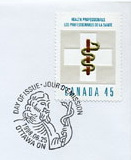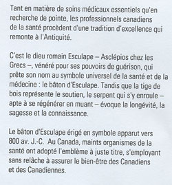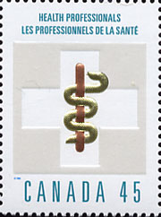 Ces mains qui guérissent sont celles de gens sur qui nous comptons énormément, nous et nos proches, lorsqu'il nous arrive d'éprouver des problèmes de santé. Médecins, infirmières, physiothérapeutes, dentistes, ambulanciers et autres professionnels de la santé contribuent en effet à atténuer nos douleurs, à traiter nos maladies et à nous maintenir bien portants. Le 25 juin, Postes Canada rendra hommage à ces Canadiens et Canadiennes qui nous sont chers en émettant un timbre commémoratif de 0,45 $. Les professionnels de la santé du pays sont représentés par plusieurs associations et organismes qui agissent en leur nom et veillent à faire respecter les normes les plus strictes en matière de soins. Le Collège royal des médecins et chirurgiens du Canada est une association privée qui a pour but de faire progresser tant les normes de l'éducation médicale postdoctorale que celles visant l'exercice des spécialités de la médecine, de la chirurgie et des activités de laboratoire. Fondée en 1867, l'Association médicale canadienne (AMC) est le porte-parole de la profession médicale au pays. Elle fait la promotion des normes les plus élevées de santé et de soins pour les Canadiens. L'Association des infirmières et infirmiers du Canada s'exprime au nom de plus de 110 000 membres sur des questions d'envergure nationale et internationale dans le domaine des soins infirmiers et de santé. L'Association dentaire canadienne est une association professionnelle qui a pour mandat de promouvoir et d'offrir des soins de santé bucco-dentaire optimaux à la population canadienne. Santé Canada est le ministère fédéral chargé d'aider la population du pays à maintenir et à améliorer sa santé. Ainsi, il élabore des politiques, applique des règlements et promeut la prévention des maladies. En outre, il dispense des soins de santé aux collectivités des Premières Nations et des Inuit. Le timbre présente, se détachant d'une croix, le bâton d'Esculape, symbole de l'AMC et d'autres organismes de la santé. L'emblème est constitué d'un serpent qui s'enroule autour d'un bâton. Esculape est le dieu romain de la médecine, identifié à l'Asclépios de la mythologie grecque. Le serpent symbolise la sagesse, l'apprentissage et la fertilité; il représente la longévité et la restauration de la santé.