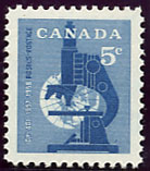 Commentaires : L'Année géophysique internationale, qui a commencé le 1er juillet 1958 et s'est terminée le 31 décembre 1958, a eu pour précurseur l'Année polaire internationale de 1882 et de 1883. Des activités scientifiques semblables ont eu lieu en 1902 et en 1903, mais un plus grand travail de recherche coopérative a débuté avec la seconde Année polaire internationale, en 1932 et en 1933. Ces projets portaient sur les régions polaires, comme leur nom l'indique. Pour la troisième Année polaire internationale, rebaptisée Année géophysique internationale ou AGI, des études de l'univers ont été entreprises dans toutes les régions du monde. Quelque 60 pays ont participé à ces travaux; plus de 25 pays ou administrations postales ont marqué l'AGI avec des émissions postales, des flammes ou des cachets spéciaux d'oblitération. Le Canada s'intéressait beaucoup aux activités de l'AGI, parce que le pôle Nord magnétique se trouve dans l'Arctique canadien et que la plus grande partie de la zone aurorale traverse le Canada. Cette émission postale canadienne constitue une évocation de plus des études sur l'univers réalisées par des scientifiques. Le microscope d'un bleu en aplat met l'accent sur le caractère scientifique des études. à l'arrière-plan, on voit, en tons plus clairs, la projection azimutale polaire du monde, où l'Amérique du Nord est représentée.