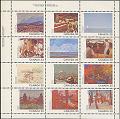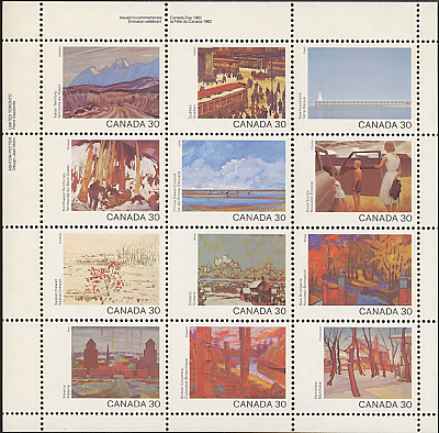 Fête du Canada - Paysages - Tableaux Commentaires : Imprimés se tenant en petite feuille de 12 timbres de 30 c. " La maison du Docteur Snider " (Manitoba) de Lionel Lemoine Fitzgerald Le Dr Robert H. Snyder (1889 - 1956) étudia la dentisterie à Chicago ( DDS en 1916). Sa maison fut l'objet d'une peinture par son voisin L. L. Fitzgerald.qui fut séduit par la simple beauté du paysage du Manitoba.