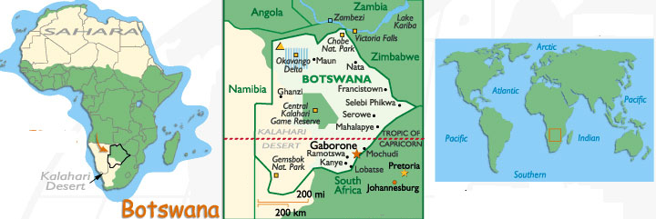 État d'Afrique australe - République (anciennement Bechuanaland) Capitale : Gaborone Superficie : 570 000 km² Nombre d'habitants : 1 812 547 (en 2004) Langue : anglais - setswana Monnaie : pula.