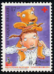 Le timbre montre un enfant jouant avec un petit ours, tous les deux se brossant les dents.