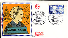 Thème : Centenaire de la naissance de Marie Sklodowska-Curie (1867 - 1934). France stamp was issued to commemorate the 100th anniversary of the birth of Marie Curie. It features a portrait of Dr. Curie and a bowl glowing with radium. Commentaires : Marie Sklodowska-Curie sa vie - son œuvre (à suivre)