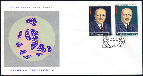 Commentaires : Médecin anatomopathologiste grec établi aux États-Unis, à l'origine du premier test de dépistage des cancers. C'est à partir d'une proposition faite en 1927 par le médecin roumain Aurel Babes (1886-1962) qu'il élabore en 1928 puis promeut le prélèvement de cellules par frottis vaginal pour détecter tôt le cancer du col de l'utérus. Cette analyse de cytologie prendra le nom de Pap-test. Encore appelée anatomopathologie, d'un anglicisme " pathologie " ou en abréviation " anapath ", l'anatomie pathologique étudie les aspects morphologiques des maladies et a ainsi une place éminente dans le diagnostic des cancers. Série de 2 valeurs : 1132 - 1133 Informations techniques :