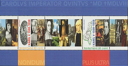 A l'occasion des 500 ans de la naissance de Charles Quint, la poste des Pays-Bas a émis ce bloc-feuillet de 2 timbres et 3 vignettes illustrant la vie de Charles Quint en 17 illustrations.