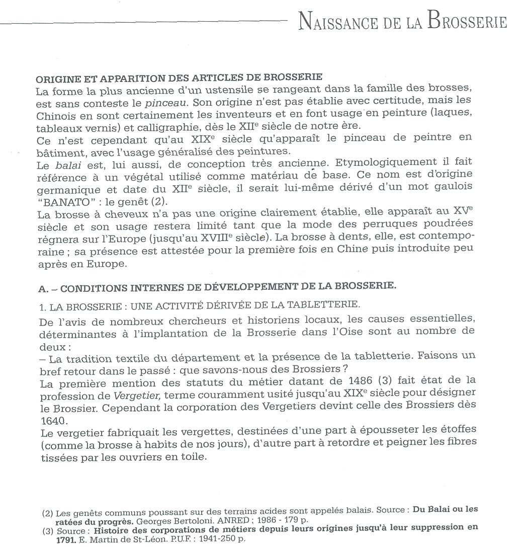 Le métier de brossier est très ancien mais c'est à partir du XIX. siècle secteurs techniques: la brosse de ménage pour l'entretien de la maison, le pinceau pour la peinture en bâtiment, le pinceau fin pour l'artiste et le maquillage, la brosse industrielle constituant des éléments de machines et enfin la brosse de toilette pour soins corporels, spécialité de notre département de l'Oise.