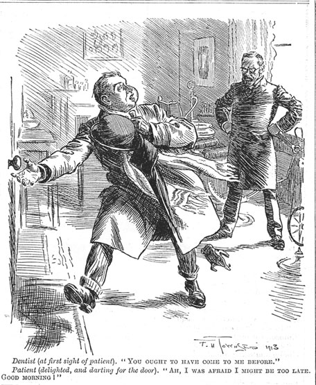 Dentist (at first sight of patient). "You ought to have come to me before."