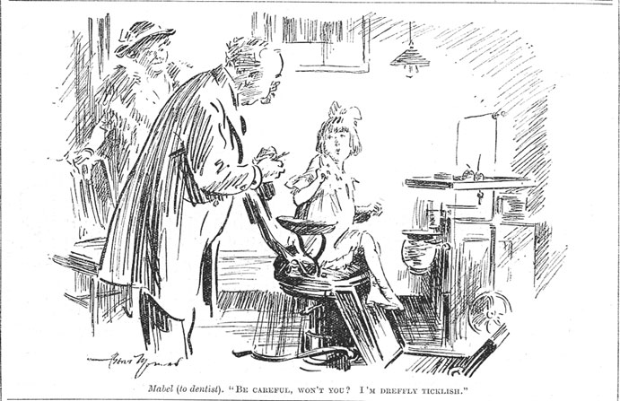 Mabel (to dentist). " Be careful, won't You ? I'm dreffly ticklish."